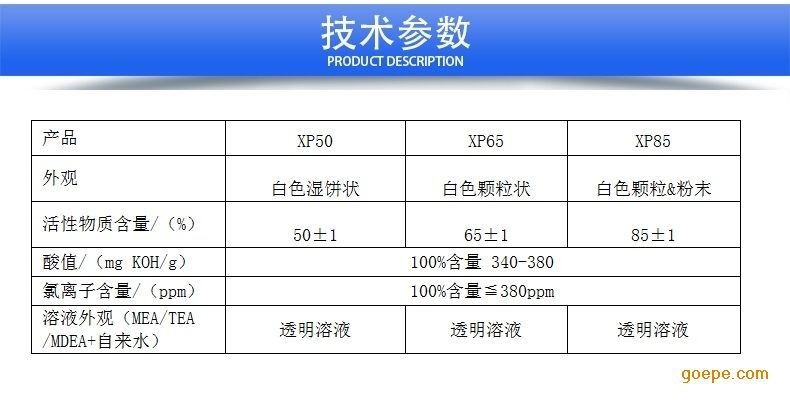 产品概述 XP50为三元有机聚羧酸,是一种绿色、环保的水性防锈剂,是各种水性液体的无灰防锈剂,对铸铁材料有高效的防锈效果,不含亚XX盐、低泡,有很好的抗硬水能力,在水质较差的地区,也能发挥出色性能。